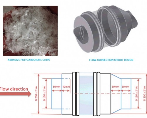 The abrasive nature of the polycarbonate chips flowing through the system prior to the cyclone meant that the existing connectors were only lasting two to five days before wearing out. In addition to the considerable cost of regularly replacing the connector, it was located in a difficult position to access, and there was loss of both production time and product with the frequent replacement.